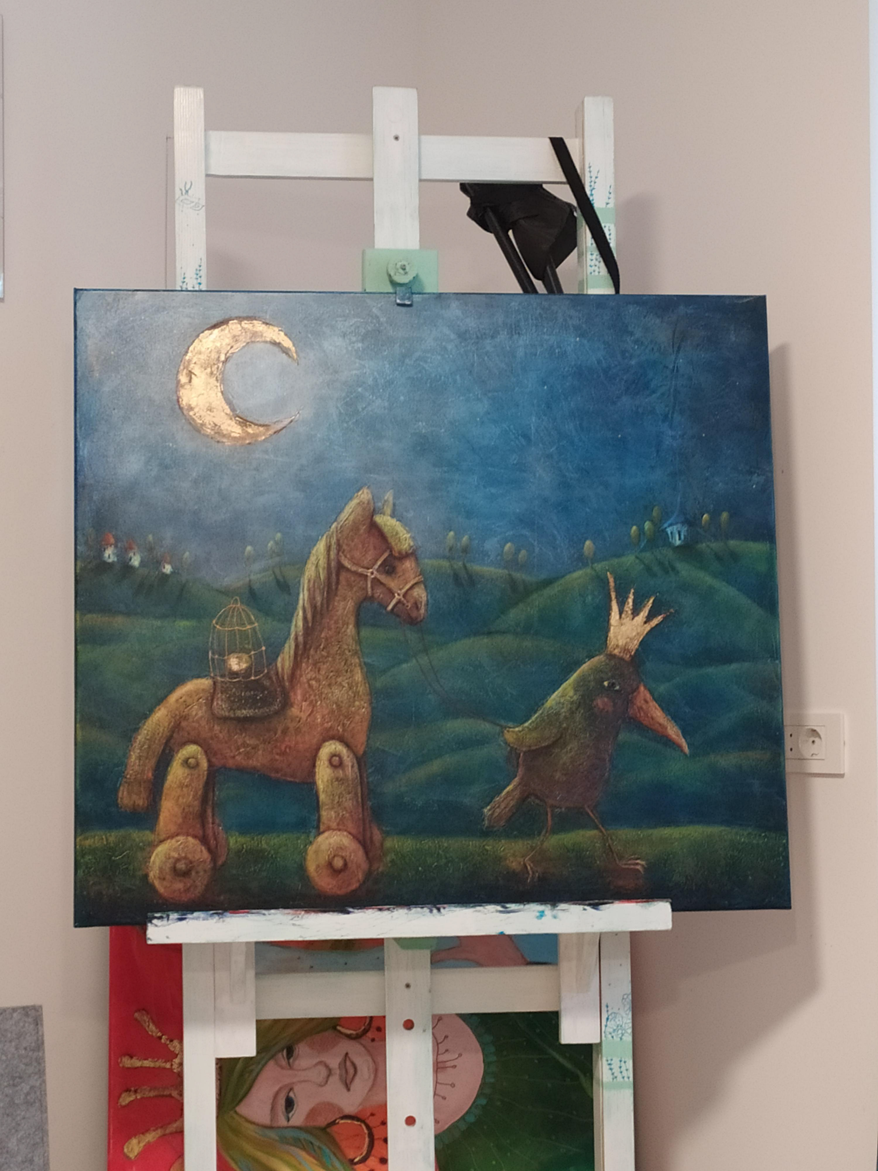 This painting is a metaphor for emotional migration, moving forward, growing up. It invites the viewer into a space where memory, fantasy and real emotions are intertwined, and where the smallest objects - like an old toy or a winged guide - can carry the weight of a dream.