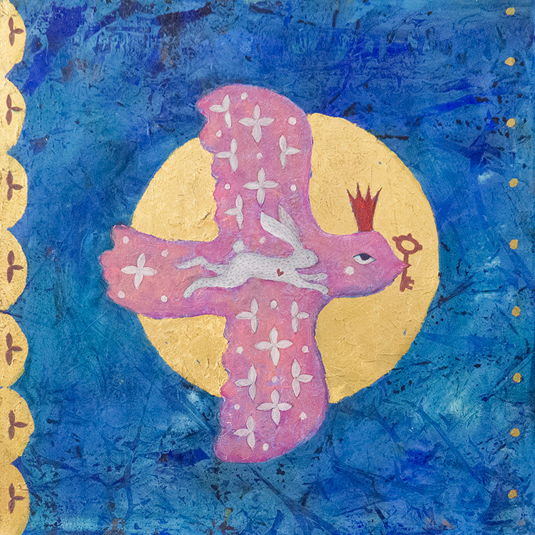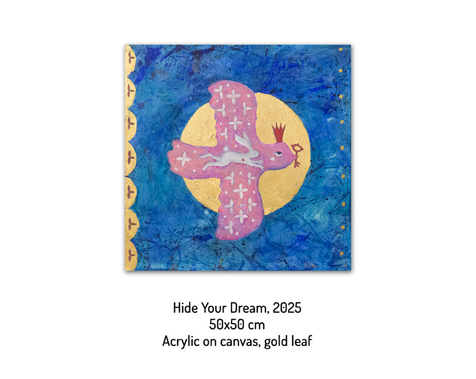 This work glows like a page from a forgotten Russian fairy tale. A crowned pink bird soars in the golden sun, carrying a tiny white rabbit with a red heart in its chest—a symbol of secret tenderness and hope. Ornamental patterns and a deep blue sky surround the painting, transforming it into a symbol of inner magic and quiet protection. It's a gentle reminder that some dreams are too precious to be revealed and should live quietly, hidden beneath wings.