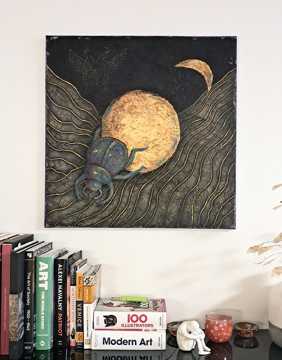This painting depicts a scarab rolling up a golden sun against a dark, textured background. The scarab's journey symbolizes the sun's daily cycle, and its movement is the promise of a new day and hope. The waves beneath it symbolize the passage of time, suggesting that despite difficulties, sunrise will always come. Gold foil adds a sense of radiance and hope, emphasizing the theme of renewal and optimism.