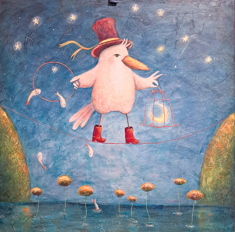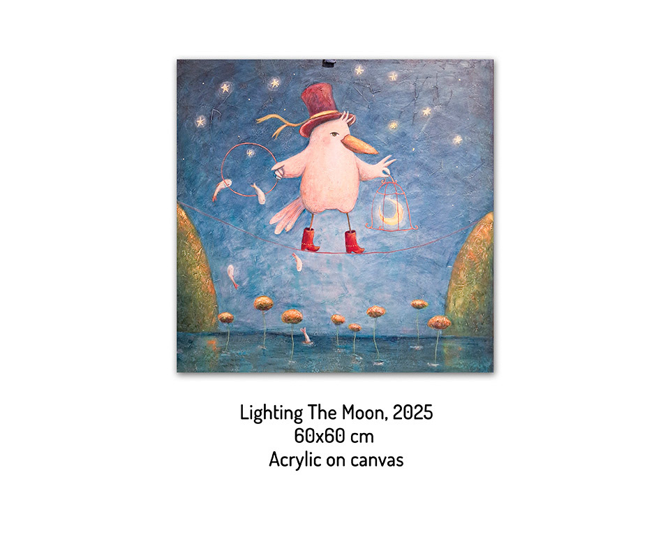 A fragile bird carries light across the night, balancing between imagination and darkness. Available / 450e